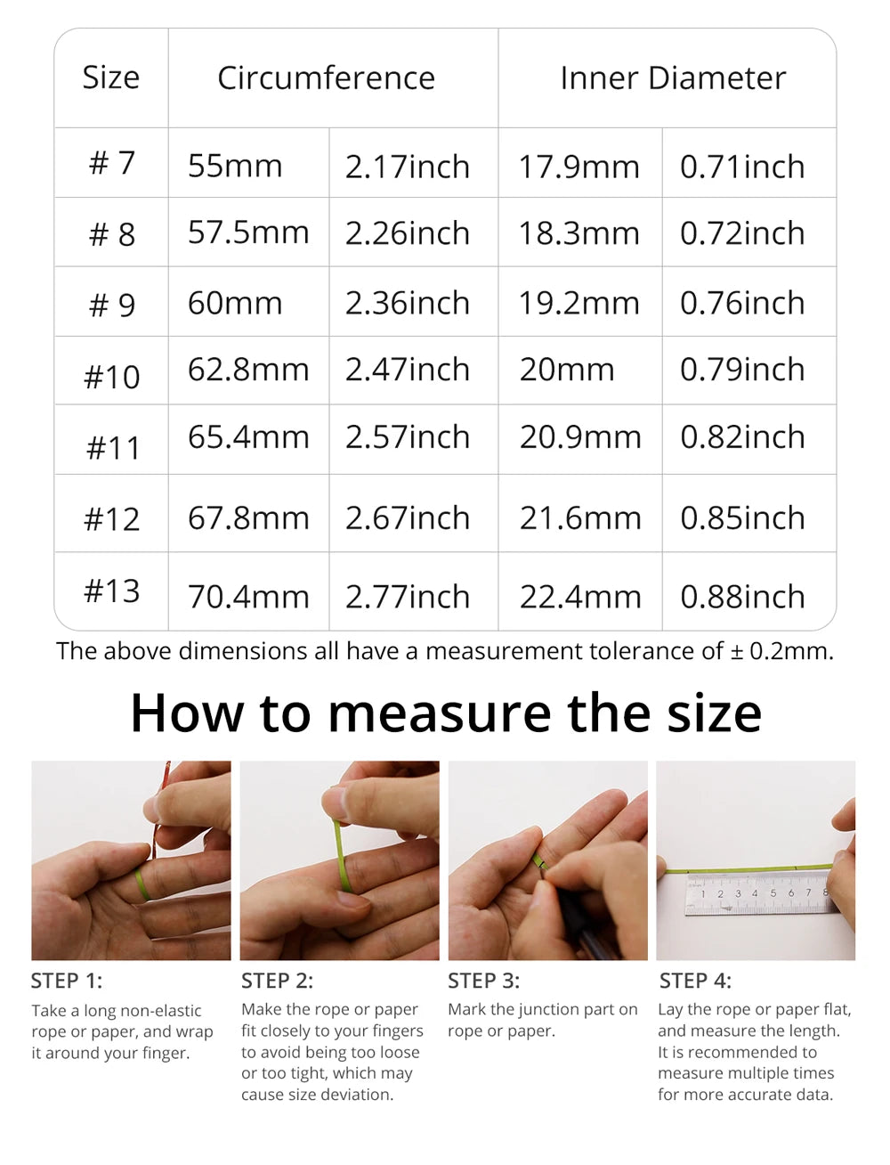 2. Please measure the circumference of your finger before purchasing, and make sure the rope or paper strip fits snugly against your finger, avoiding being too loose or too tight. (Please use a thinner piece of string or paper strip to measure the size. If the measuring tool is too wide, the measurement will be large.)
