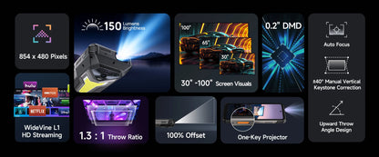 150 Lumens Projector | True 100% Offset|±40° Keystone Correction